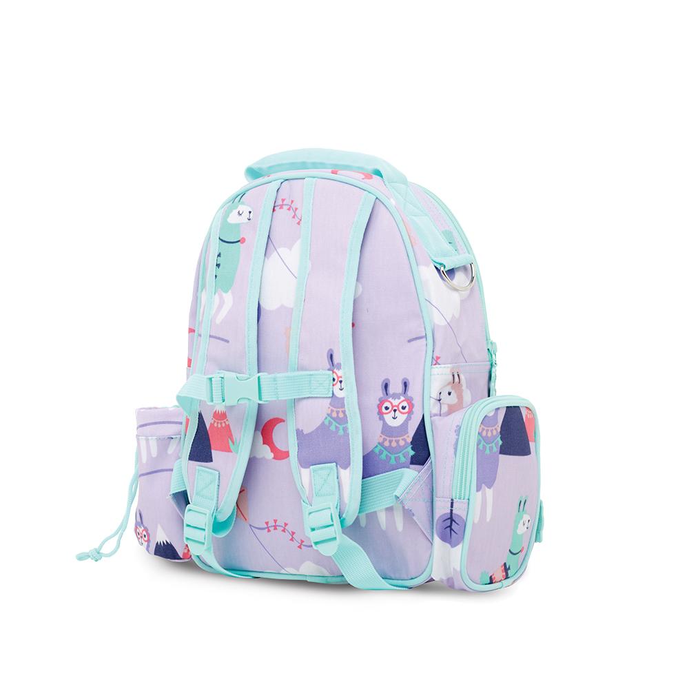The backpack has two front pockets, a small zippered pocket on the side and a drink bottle holder. It also has a matching bag tag with an area to write your name on the back.