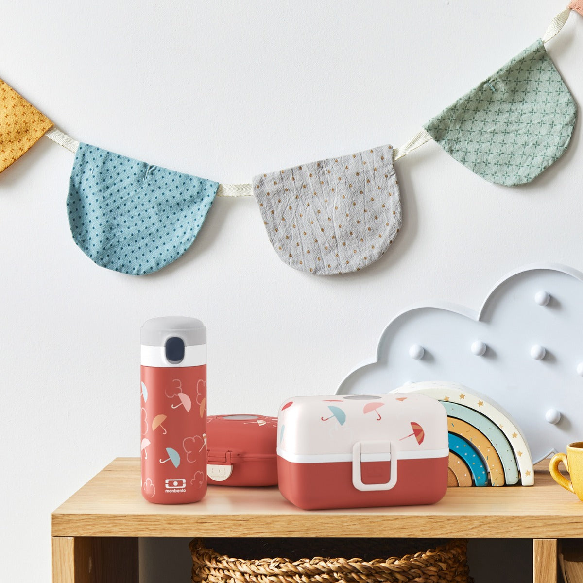 With its warm terracotta hue and its pretty, colourful umbrellas floating in the air, the MB Gram orange Umbrella snack box invites kids to let their imagination soar in the middle of the afternoon.
